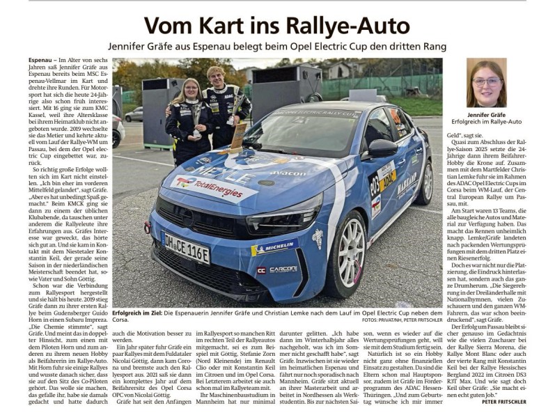 Am 05.09.2025 startete Jennifer Gräfe als Beifahrerin bei der Rallye Mont Blanc in Morzine im Opel E Cup mit Fahrer Christian Lemke. Voller Freude auf diese besondere Rallye gingen die beiden an den Start. Das Wetter war leider mit Regen sehr durchwachsen und dennoch fuhren sie erfolgreich auf den 5. Platz.