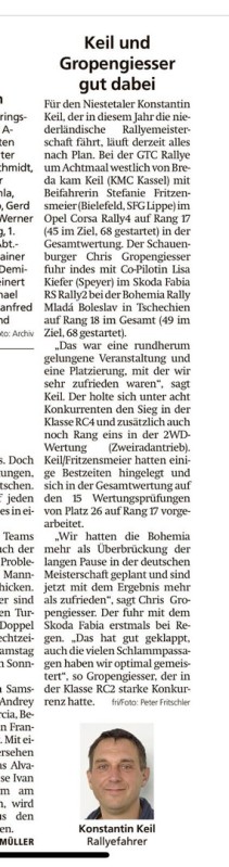 Keil zeigt dann aber auf der Powerstage eine grandiose Leistung und sicherte sich die notwendige Punkte, die im Ziel der Rallye zum Gewinn der Meisterschaft ausreichten. Im Ziel waren Keil/Fritzensmeier überglücklich. Keil: „ Das war eine unglaubliche Leistung des gesamten Teams. Am Freitag schien der Titelgewinn nach dem technischen Defekt nahezu aussichtslos, und nur durch den unglaublichen Einsatz des gesamten Teams haben wir diesen Erfolg am Ende doch erreicht“. Auch Keils Copilotin Stefanie Fritzensmeier war voll des Lobes über das Team, besonders aber über ihren Fahrer : „ Das war schon unglaublich nervenaufreibend, der Titel war schon fast unerreichbar, und Konstantin hat dann auf der Powerstage mit einem Husarenritt gezeigt, dass er ein würdiger Meister und schnellster Pilot mit einem Fahrzeug ohne Allrad in Deutschland ist. Und ohne unser sehr professionelles Serviceteam hätten wir diesen Erfolg nie erreicht“.